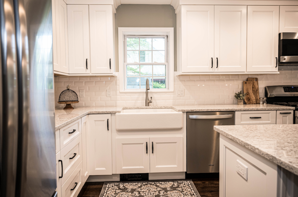 For these homeowners, the old kitchen floor plan just did not work, as the space felt cramped and counterspace was minimal thanks to an intrusive doorway. The new layout we created replaced that doorway with pantry cabinets and a refrigerator, and what a difference this tweak makes.